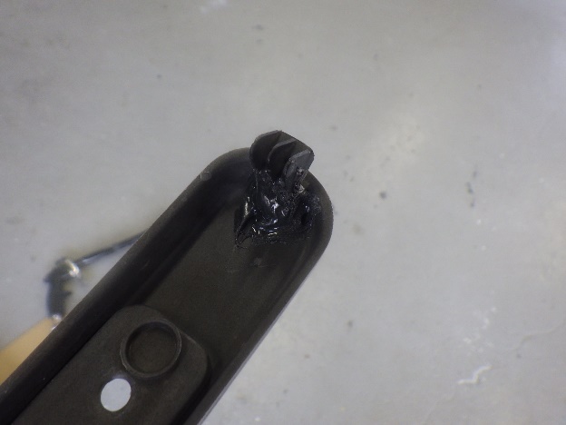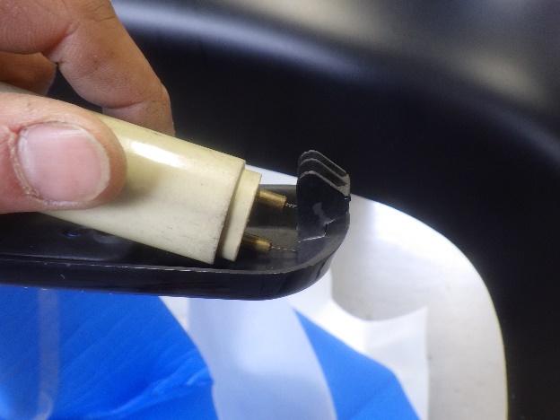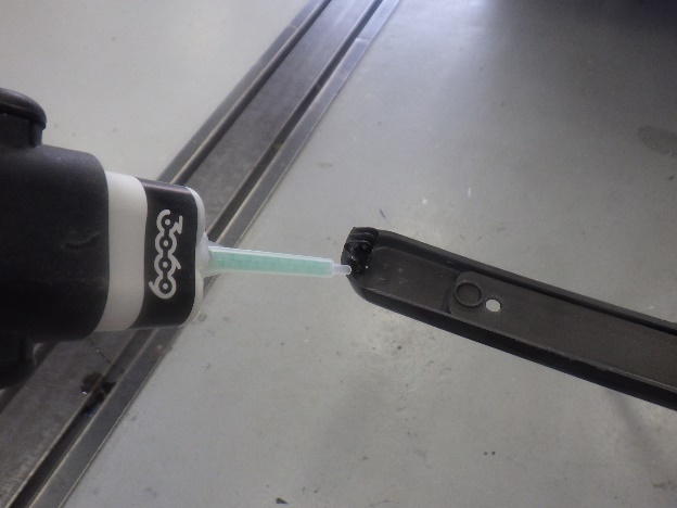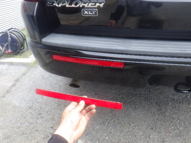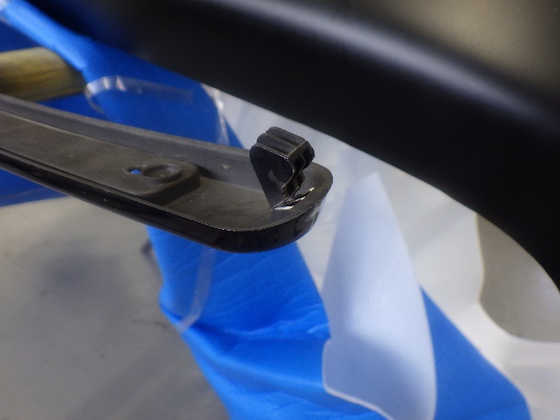 内部への損傷が無い事を確認した後、新品のリヤバンパーへモール取り付けの為の、