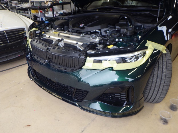 分解作業の後、損傷があり凹んでいたフロントフェンダーへ、パテ付け準備(足付け、マスキング、脱脂、エアブロー)を行い、パテ付け作業を行いました。