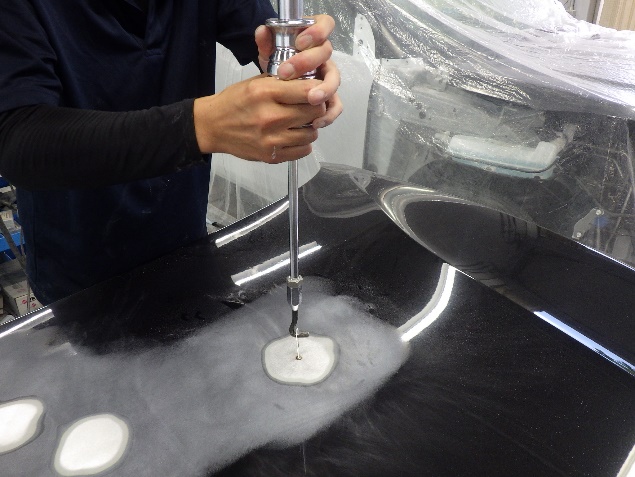 鈑金修正の後、パテの密着性向上の為、足付け、紙貼り、脱脂、エアブローを行い、