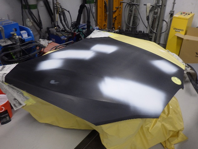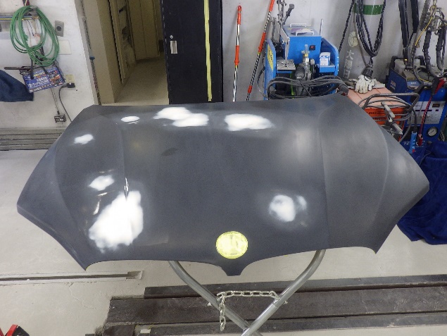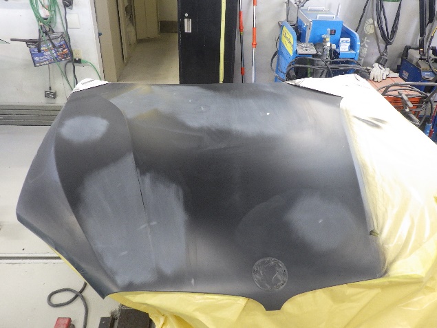 パテ乾燥の後、パテ成形作業、脱脂、エアブローを行い、サフェーサー塗布作業を行いました。