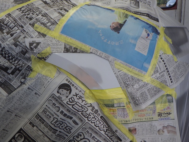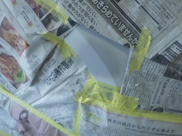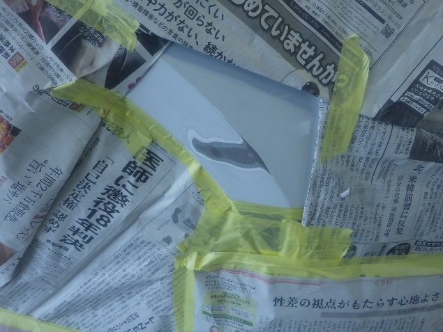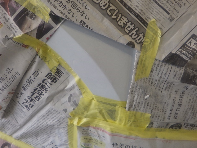 サフェーサー乾燥の後、足付け、紙貼り、脱脂、エアブローを行った後、
