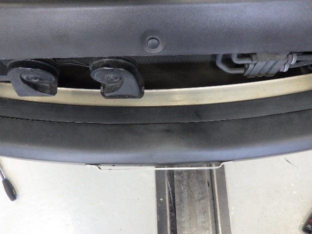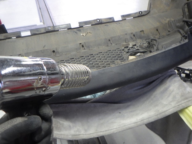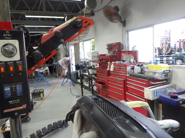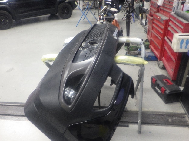 中古ボンネットの付け替え作業、フロントバンパーの修正作業を行う為、