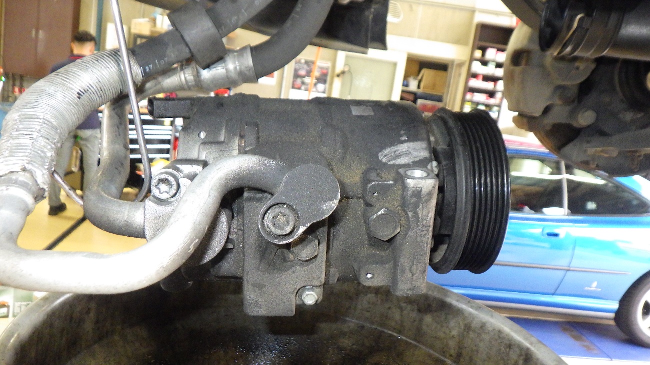 エアコンのコンプレッサーを切り離して吊り下げてかわして作業を行っております。