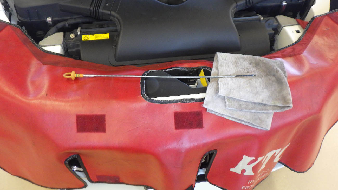 エンジンオイル交換後、暖気状態でオイル量点検を実施。