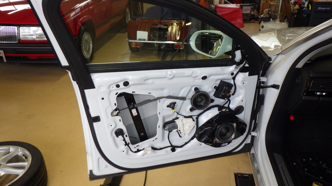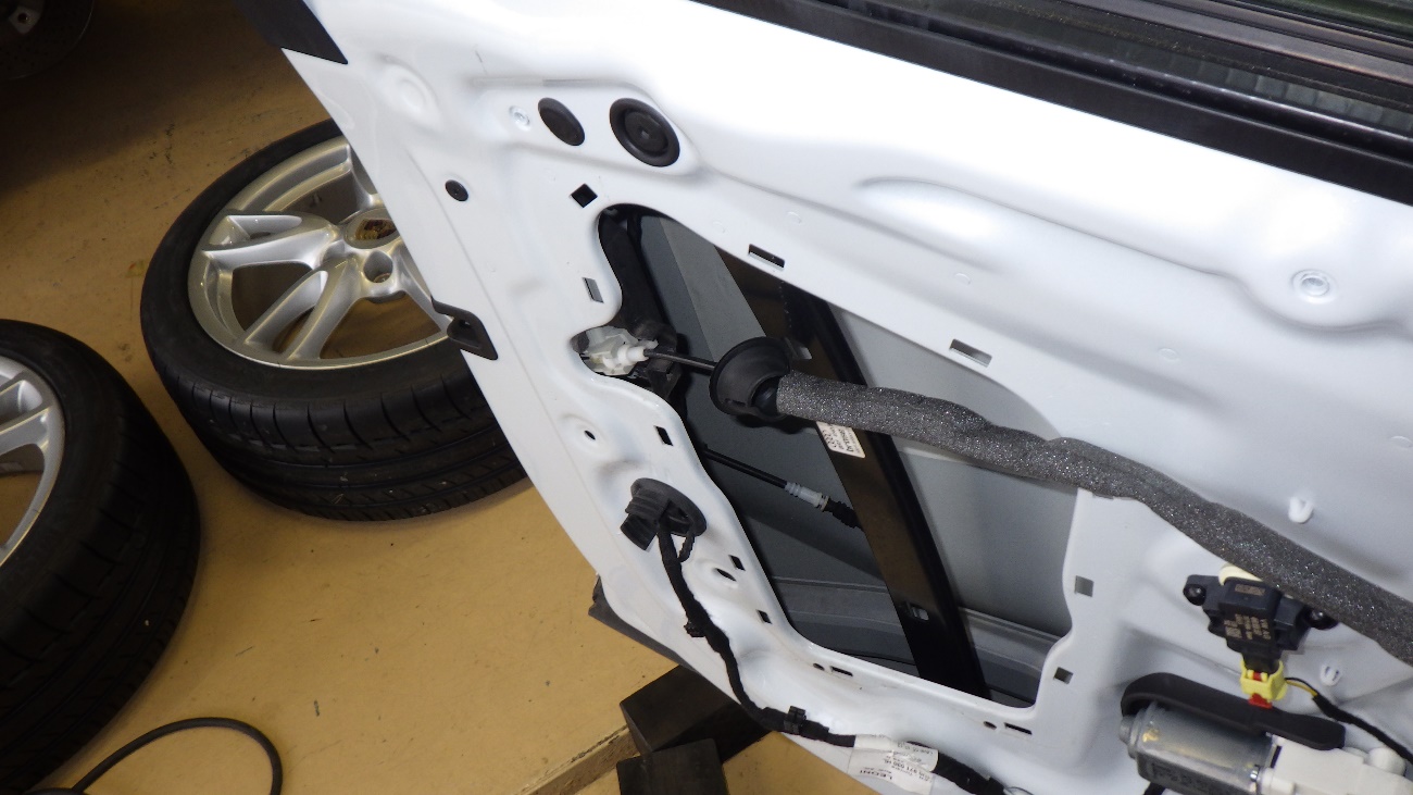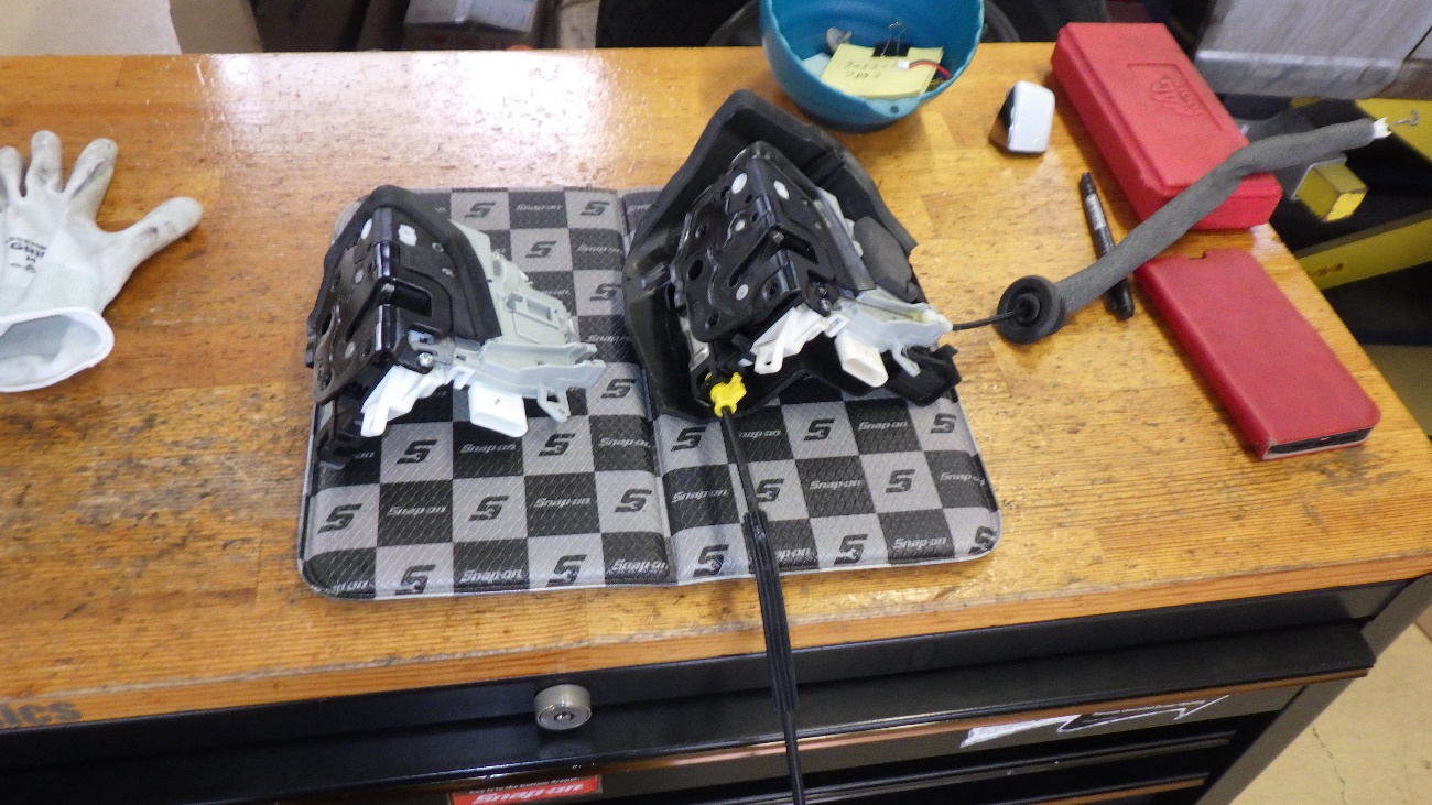 助手席側のドアロックの開閉時に異音がしており、モーターのギヤスリップの可能性がございますので交換作業に取り掛かって参ります。