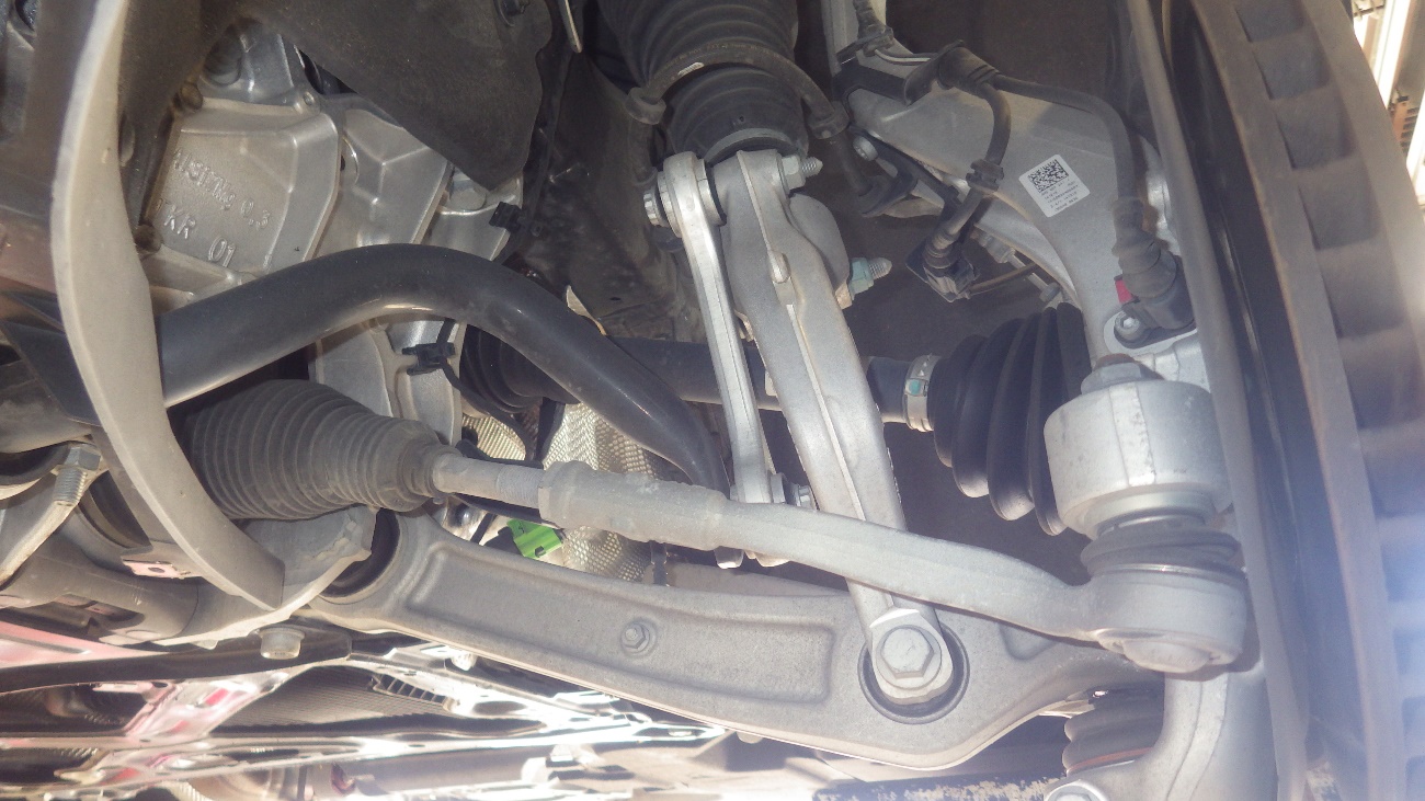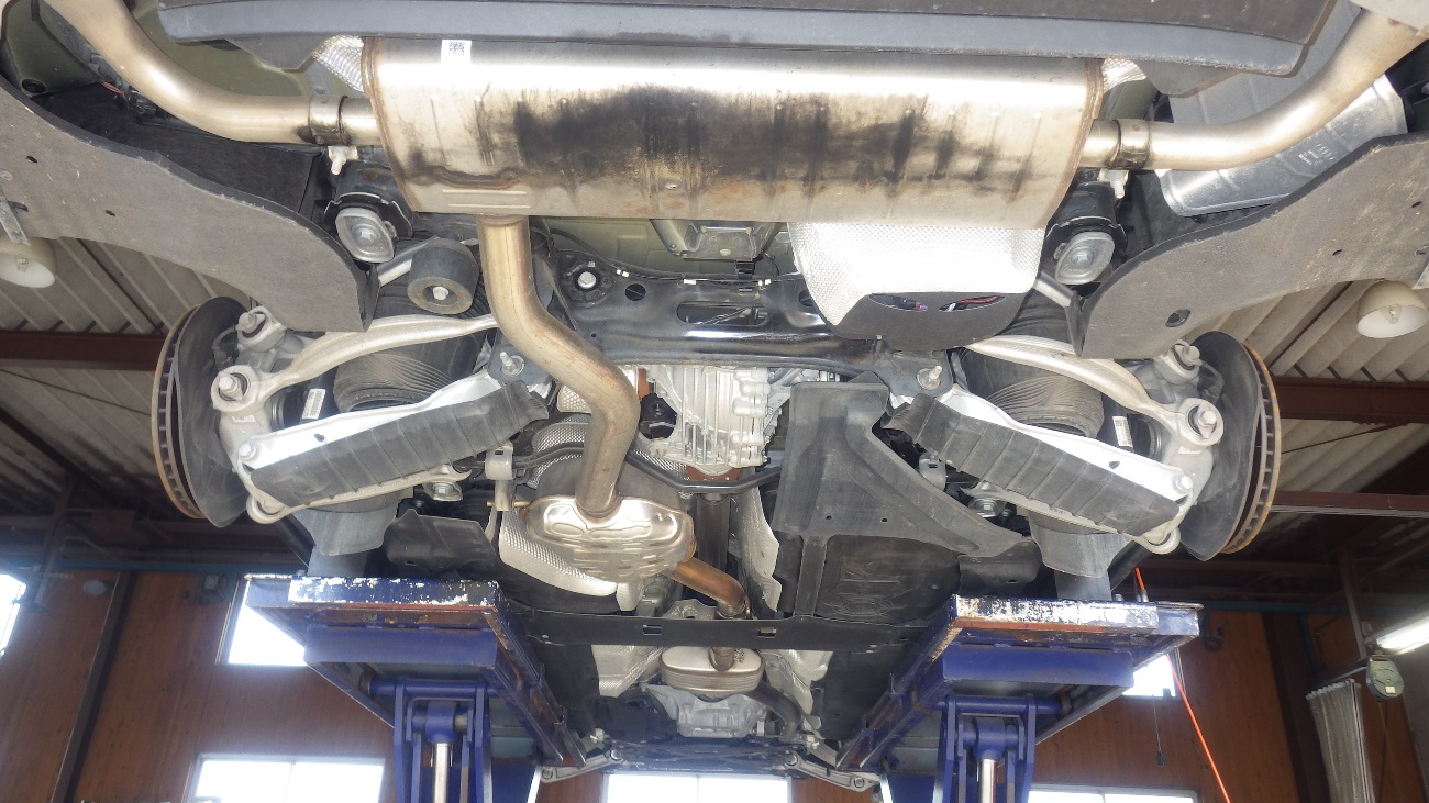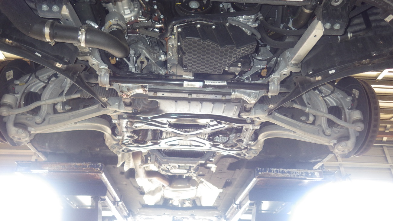 アンダーガードを外した状態のフロント部の下廻りの点検様子になります。