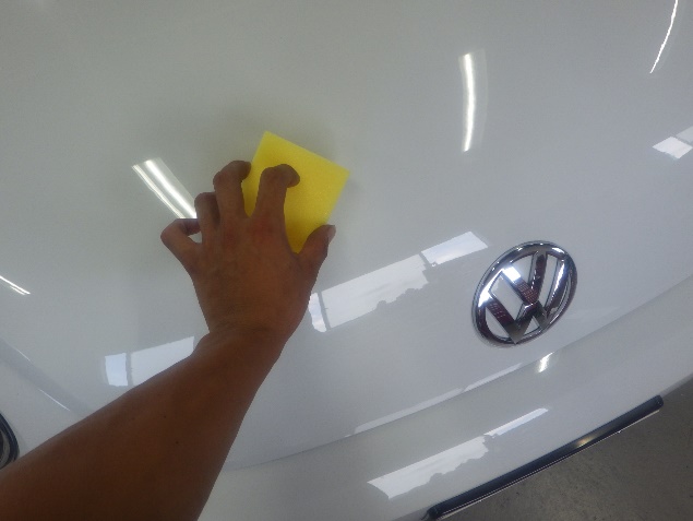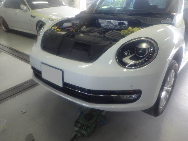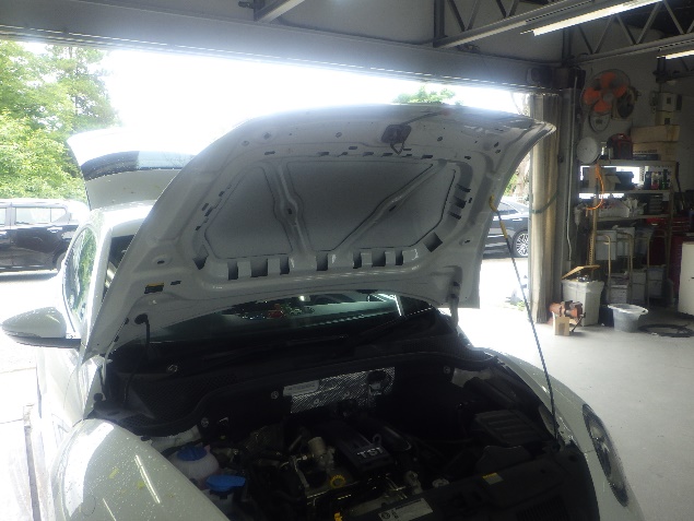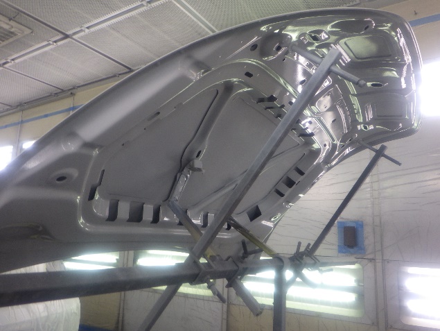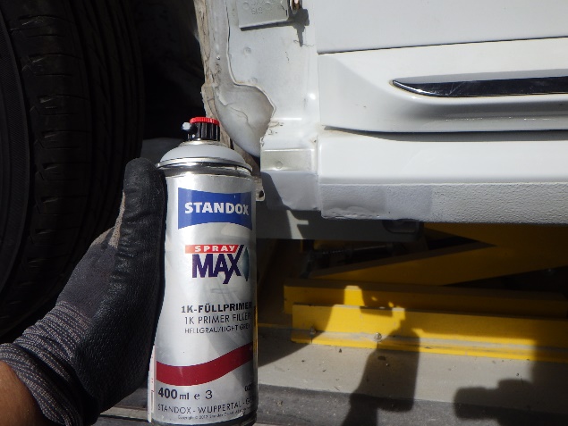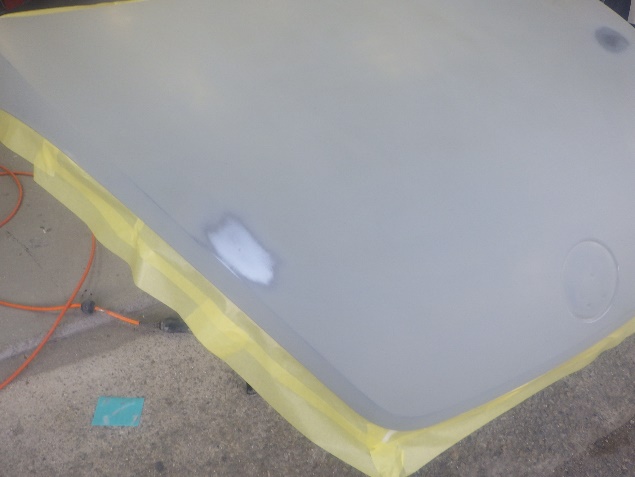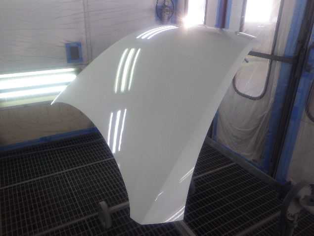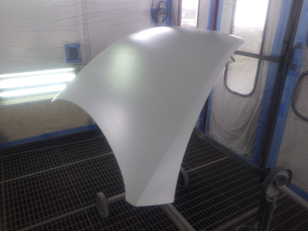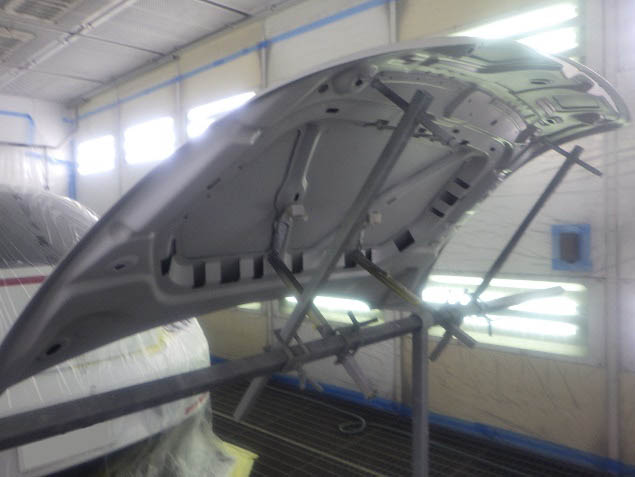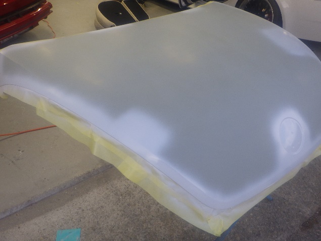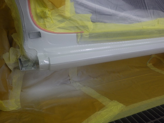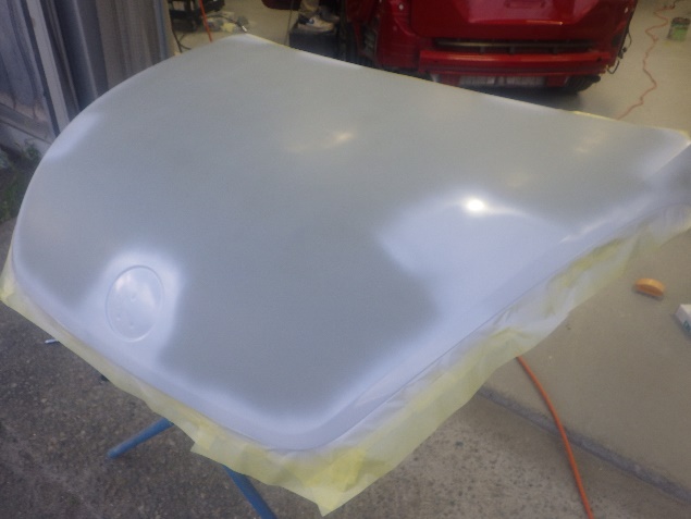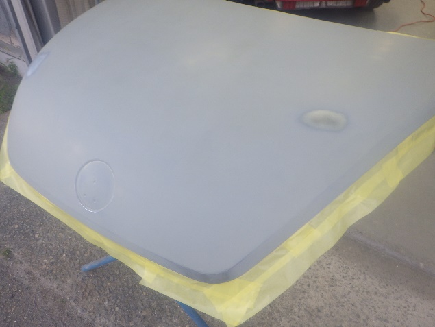ドアシルパネルへのアンダーコート塗布の後、エンジンフードの足付け、マスキング、