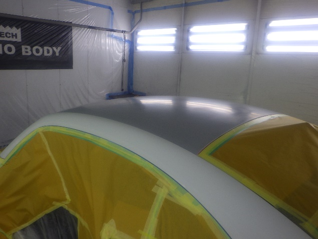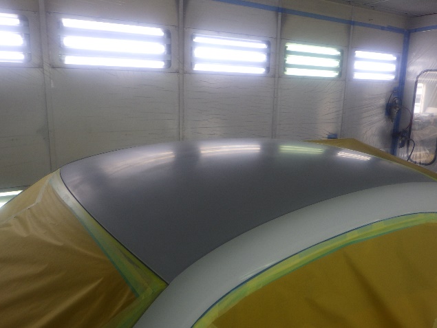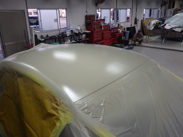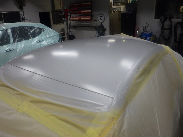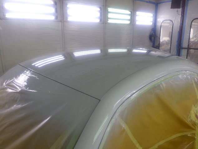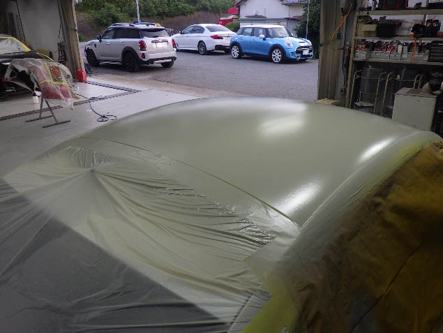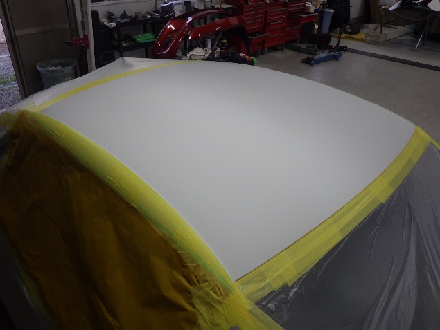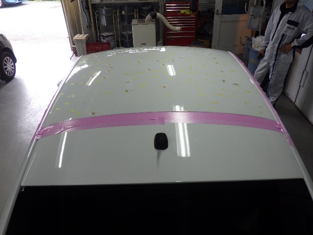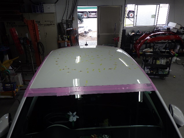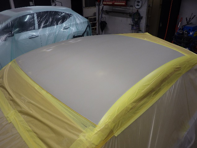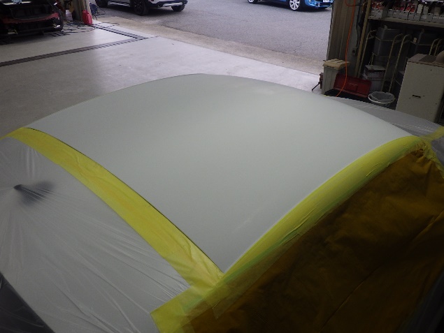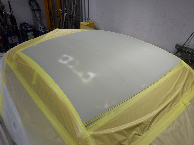 分解作業の後、ルーフパネルの足付け、紙貼り、脱脂、エアブローを行い、