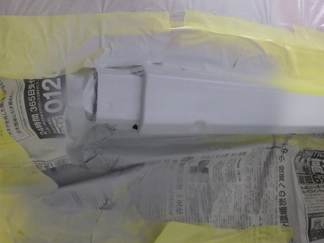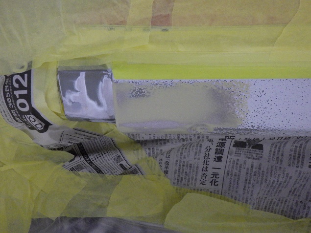 プライマー塗布作業の後、紙貼りを行い、ベースコート(白)、トップコート(クリヤー)の