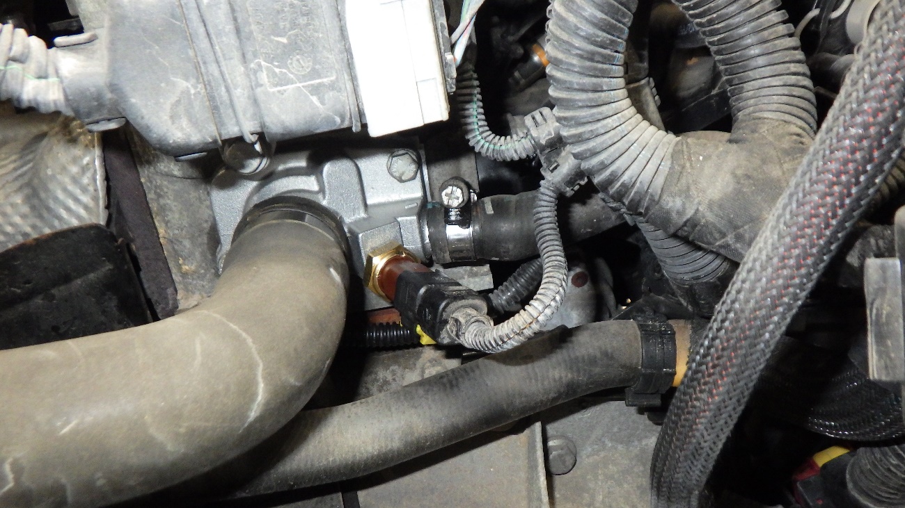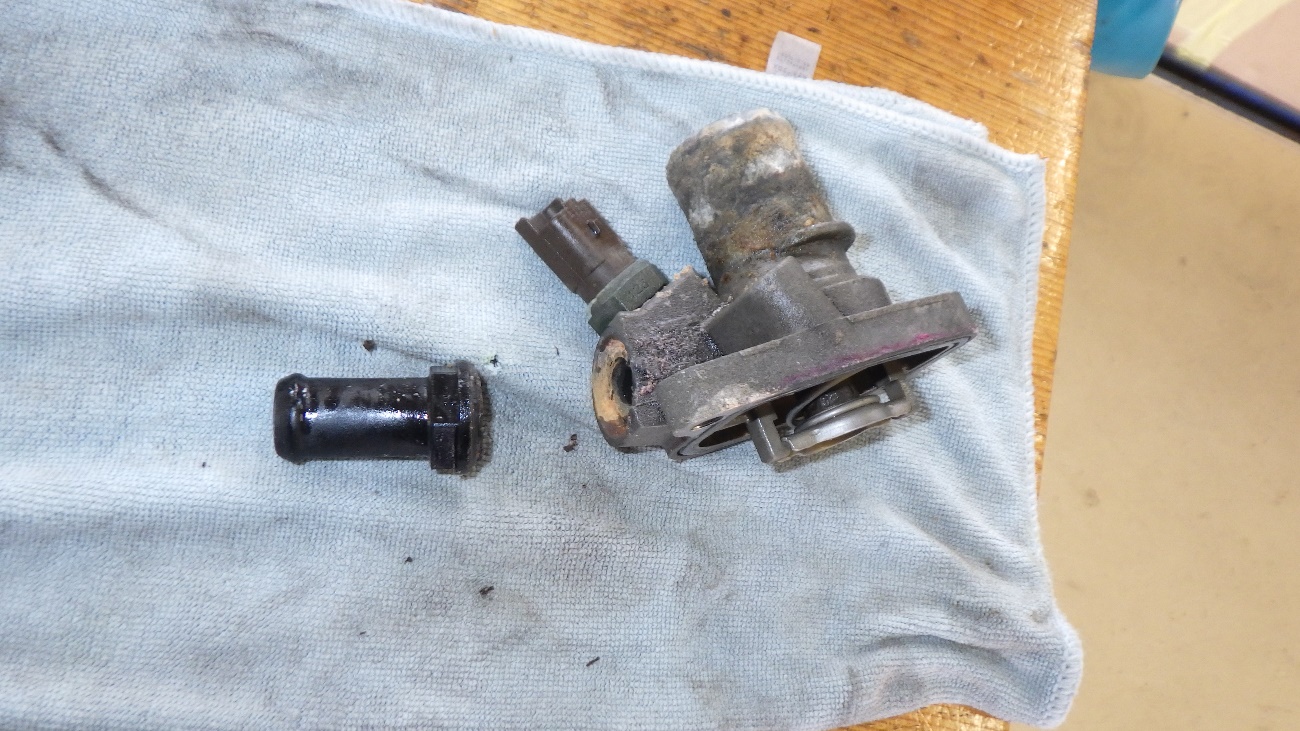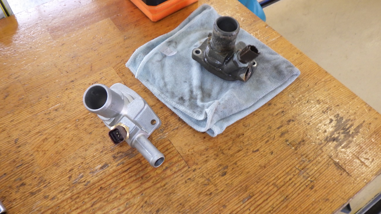 サーモケースが組み上がった様子になります。交換後クーラントのエア抜きを実施。