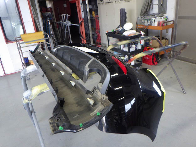 パテ乾燥の後、サンディング作業、マスキング作業、脱脂作業、エアブローを行い、